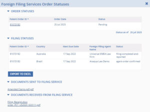 Tous les documents correspondants sont automatiquement joints aux instructions de dépôt, y compris les revendications et l’historique de recherche. Chaque type de document est rangé dans des répertoires individuels, tandis que notre système intelligent de remplissage des formulaires évite les redondances. Toutes les informations sur le dépôt de brevet et tous les documents s’y afférant (traductions, reçus officiels, demandes) sont automatiquement ajoutés au dossier. Résultat : du temps gagné pour votre équipe, qui évite aussi les erreurs de saisie manuelle.